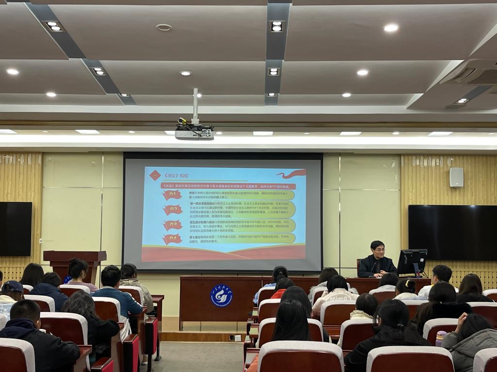 为深化拓展党史学习教育,学习宣传贯彻好党的十九届六中全会精神,12月20日,fun88官网体育经理孙法柏为法学2021-1班同学宣讲党的十九届六中全会精神。