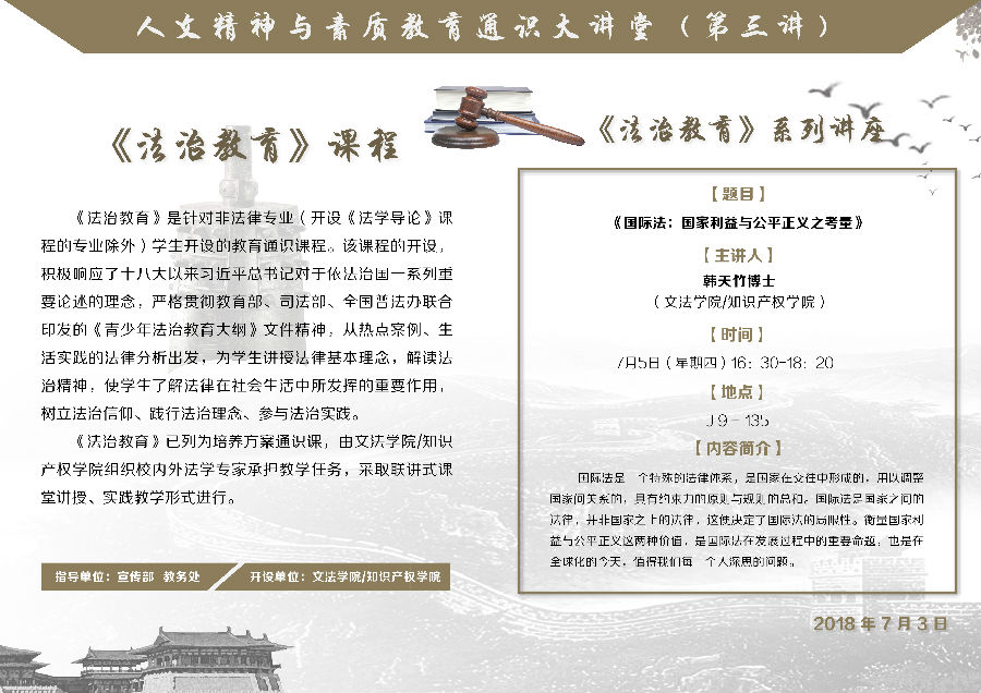 【讲座预告】人文精神与素质教育通识大讲堂——国际法:国家利益与公平正义之考量