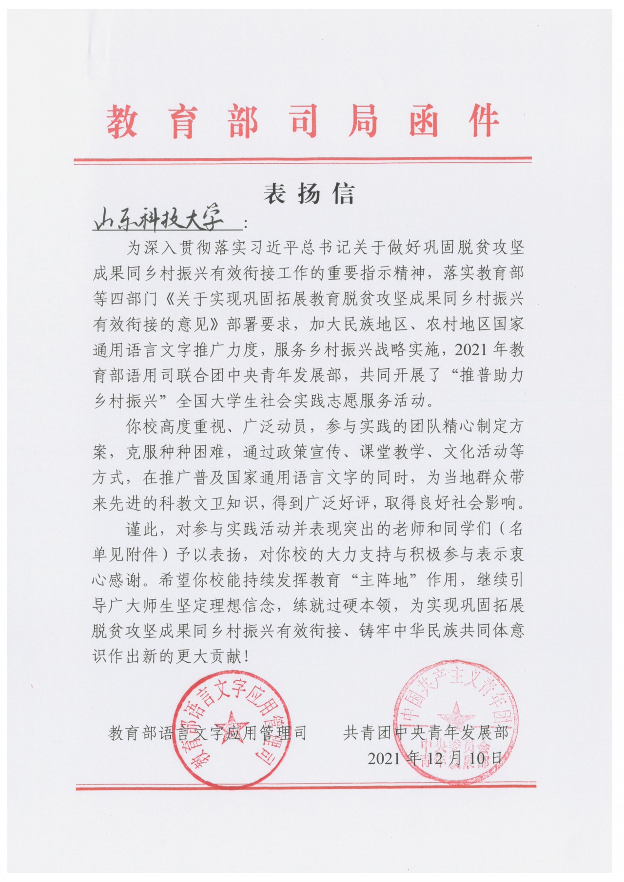 近日,汉语言2020级庄羽桐等多名同学参加的“推普助力乡村振兴”全国老员工社会实践志愿服务活动被教育部语言文字应用管理司、共青团中央青年发展部致信表扬。