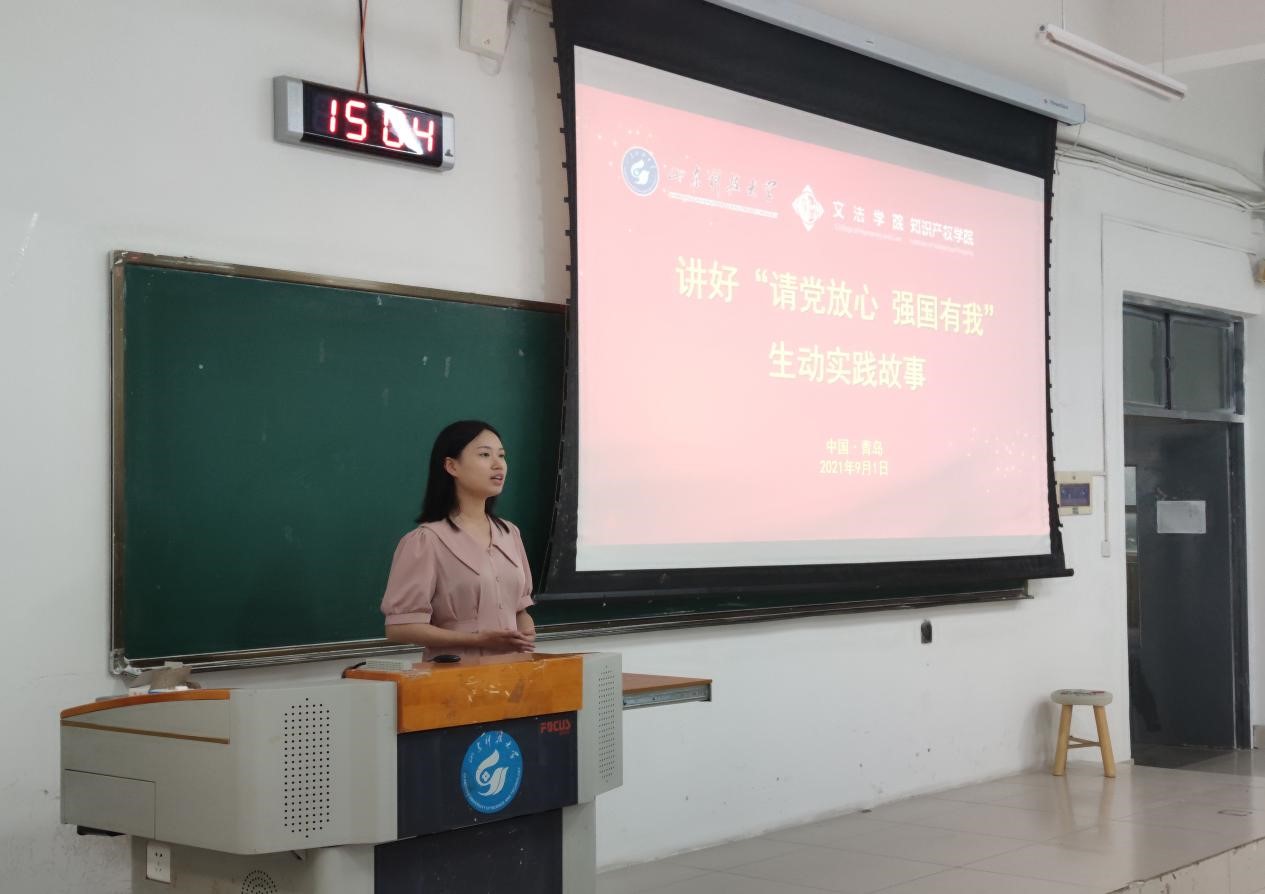 辅导员韩丙华从回顾、总结、展望三个方面展开年级大会,首先以学习贯彻习近平总书记“七一”重要讲话精神,积极响应“请党放心,强国有我”号召为引子,再次带领大家回顾“百年讲话”;接着他从学年成绩分析、第二课堂成绩单、暑期社会实践总结、迎新事宜、新学期疫情防控要求等联系我们多个方面,要求同学们尽快切换“频道”,进入开学模式,在学习生活中强化纪律意识、榜样意识。会上,法学四班姜晓红向同学们介绍了第二课堂的有关事宜,帮助同学们详尽了解了第二课堂的申报工作细则;汉语言文学专业张莹莹同学作为“微光”实践团队代表,给同学们分享了自己“请党放心,强国有我”的实践活动经历和收获。