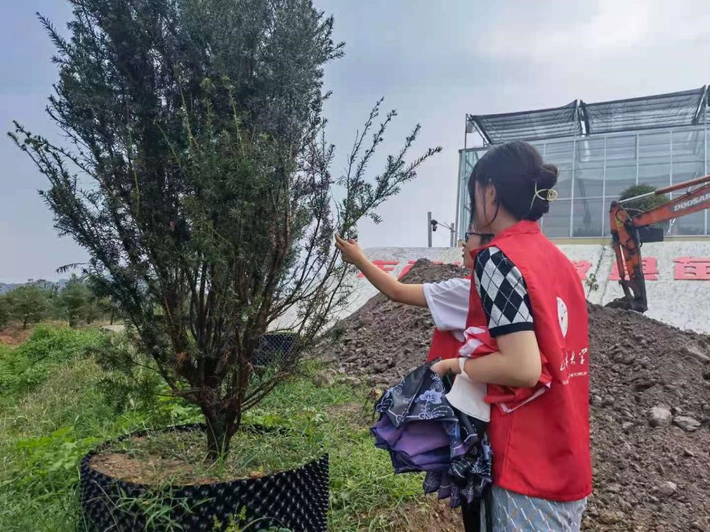 图为实践团成员在种植基地观察曼地亚红豆杉长势情况