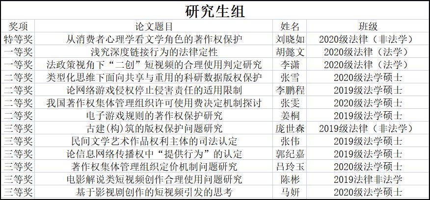 此次征文活动分为本科生组和研究生组,共设版权法基本理论研究、版权行政保护研究、版权司法保护研究、著作权集体管理制度研究等八大主题,参赛选手从中选取相应主题进行投稿。经过收集汇总、查重、分类、专家匿名审阅、评分等多重环节,共有20篇论文突出重围,其中研究生组13篇,本科组7篇。获奖名单公布如下: