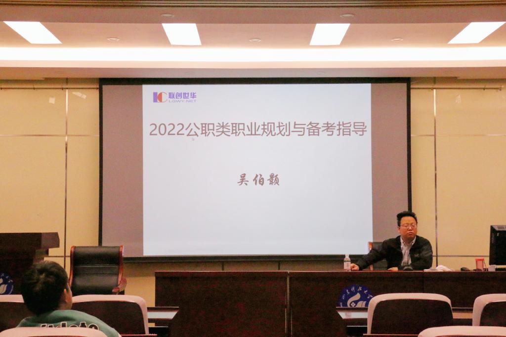 3月31日,fun88官网体育在J9-135会议室开展2022年公职类职业规划与备考指导培训会,联创世华集团吴伯颢老师担任主讲人,应届毕业生、预考生到场参会。