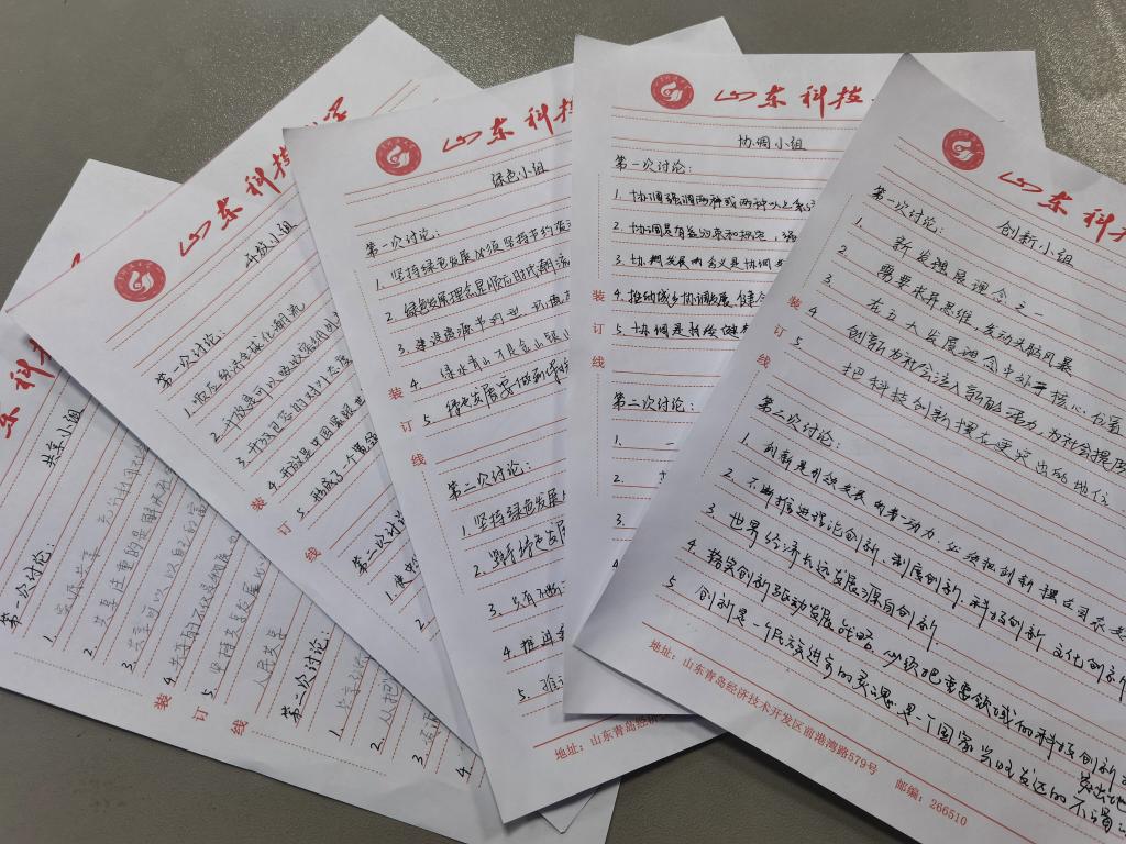 此次活动由新时代新篇章、新讨论新气象、新青年新作为三个部分组成,且主要以主题学习讨论会的形式开展。在“新时代新篇章”环节中,主持人为同学们介绍了中国进入新时代后在各领域取得的突出成就及指导其发展的相关思想,并着重阐释了创新、协调、绿色、开放和共享五大发展理念的内涵。随后,进入“新讨论新气象”环节,在场同学们被随机划分为五个小组并进行两轮小组讨论。第一轮讨论中,五个小组的同学们分别对创新、协调、绿色、开放和共享这五个关键词进行理解、讨论,并将小组讨论内容写在事先准备好的答题纸上;第二轮讨论中,除每组组长固定位置不动外,其它同学交换位置,随机选择小组,并对所选小组所写内容进行补充、调整。讨论结束后,每组组长展示本组最终成果。最后,进入“新青年新作为”环节,同学们争相起立讲述自己的目标以及如何实现目标,现场氛围热烈,将活动了推向高潮。