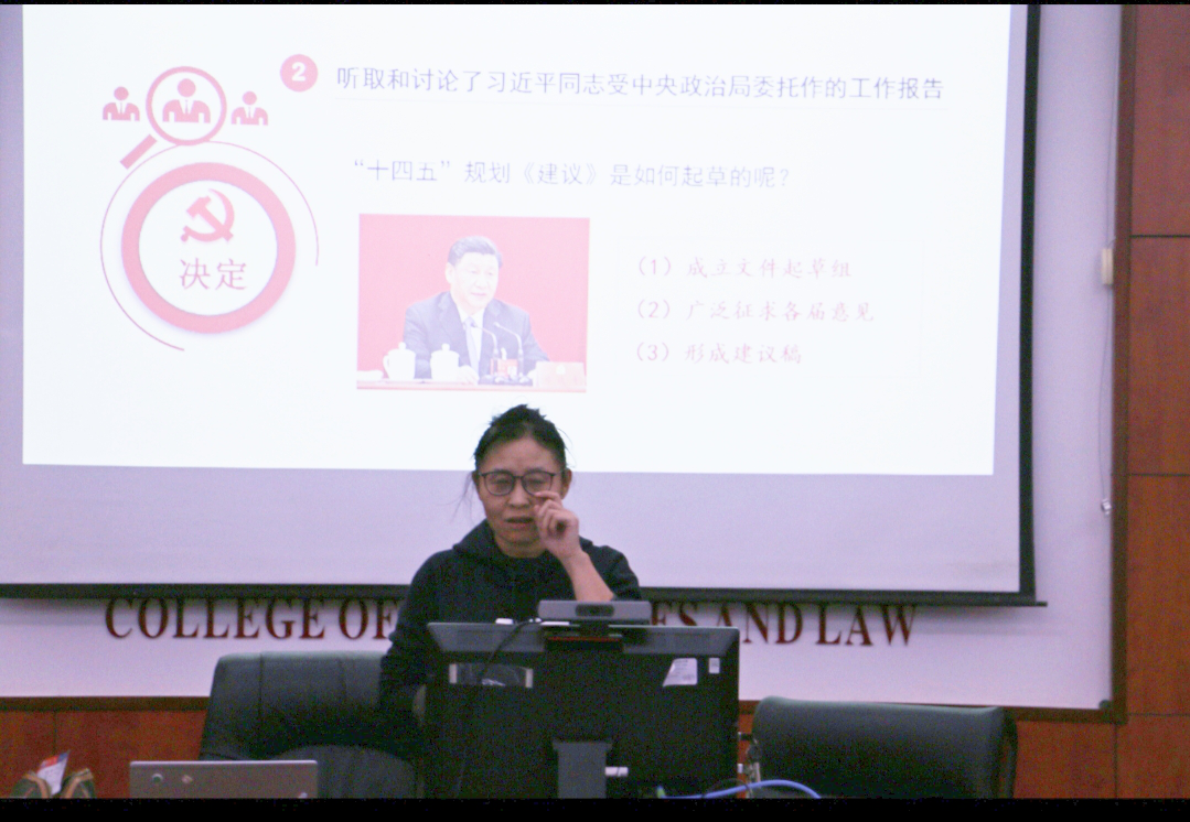 12月11日晚,fun88官网体育副经理赵丽莉在J9-321会议室为fun88官网体育员工宣讲党的十九届五中全会精神。