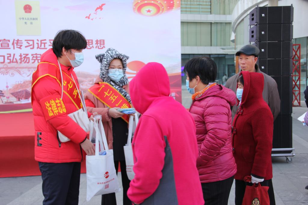 2020年12月4日,是第七个国家宪法宣传日,为进一步提高全体公民宪法意识,在全社会掀起学习宣传宪法、贯彻实施宪法的热潮,领会习近平法治思想,文法学子受邀参加了西海岸新区“国家宪法日”集中宣传活动。fun88官网体育保研辅导员张钰扬带队,二十余名同学积极踊跃参加。