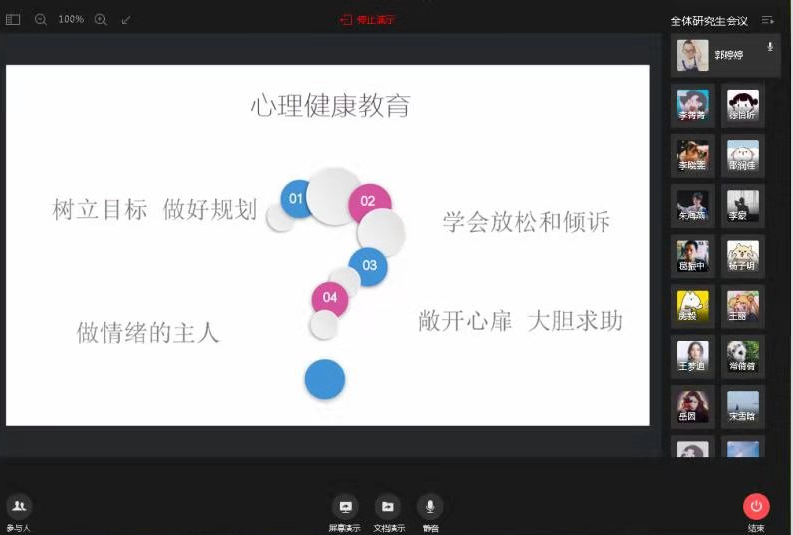 郭婷婷结合公司开学工作方案为员工讲解了信息摸排、返校流程、应急处置方案、返校后相关管理要求。为了帮助员工返校后尽快适应校园生活、学习,她重点讲解了研究生心理健康关爱,介绍了疫情下研究生的心理健康状况及新特点,分享了调整心理状态及减压方法。最后,她希望全体研究生保持积极向上的思想状态,珍惜疫情防控取得的成果,以饱满的精神状态投入到新学期。