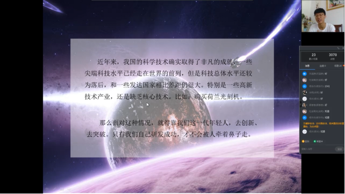 图为支教队员在讲解我国的科技水平