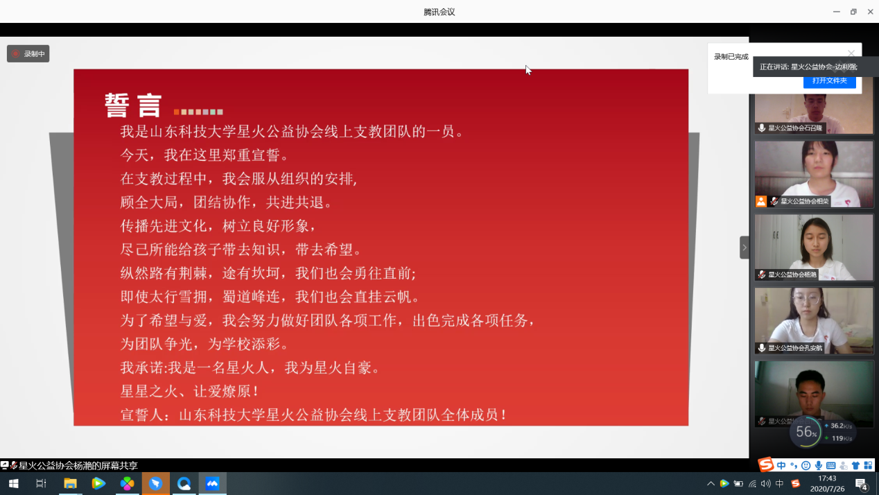2020年疫情肆虐、人心惶惶,但同时,“停课不停学”的“云课堂”应运而生,孩子们通过手机和电脑就能接收到来自中国大地任何一个角落的知识。星火公益协会克服重重困难,在团委和指导老师的支持下,继续传递星火接力棒,通过线上支教的形式,为山东临沂郯城胜利镇的孩子们带去丰富多彩的趣味课程。