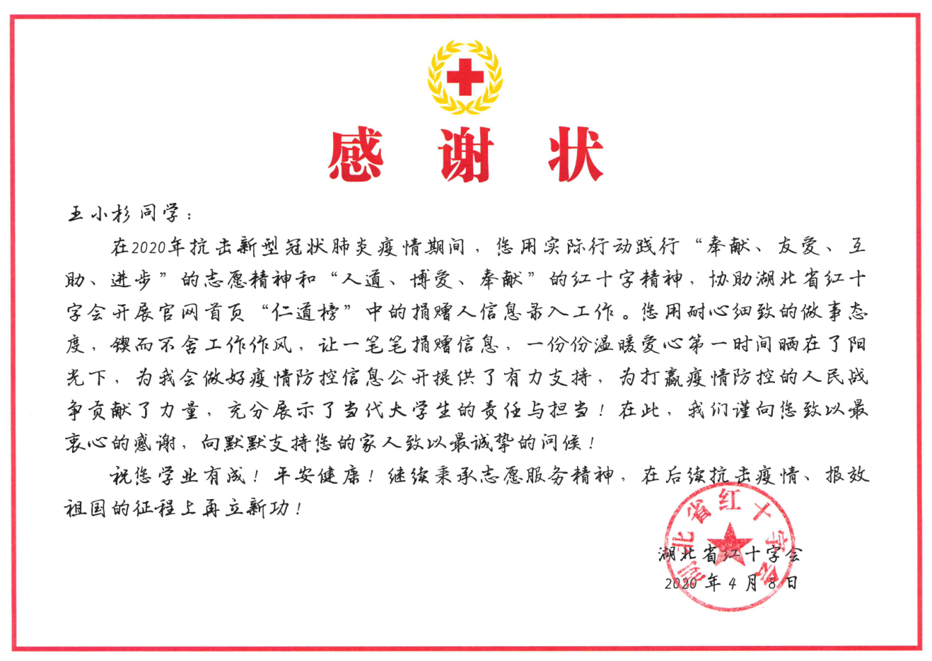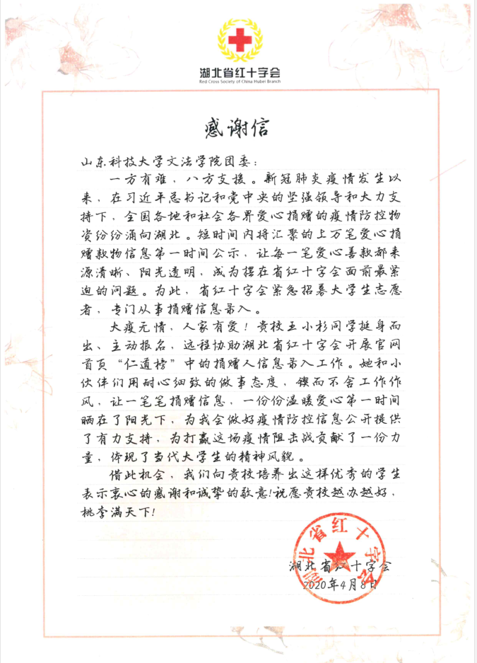 近日,fun88官网体育收到来自湖北省红十字会的感谢信,对公司人才培养工作给予充分肯定和认可,对法学2017级1班王小杉同学在抗击疫情志愿服务工作中的突出表现作出高度赞扬。