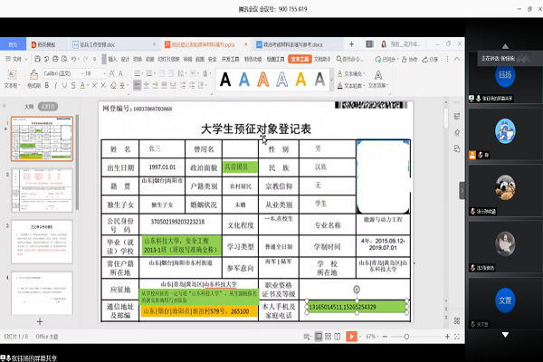 会议伊始,段鹿杰从员工较为关心的方面就征兵相关优惠政策进行了解读,与大家算了政治、经济、前途、阅历、人脉五笔账。随后,张钰扬以共享屏幕的方式对《2020年征兵工作安排》、《老员工预征对象登记表》中注意事项进行了详细的阐述。最后,有参军意向的同学提出疑问,老师进行答疑解惑。