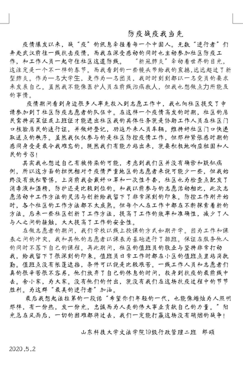 五四精神是中华民族百折不挠,自强不息的民族精神的生动写照。疫情期间,无数青年人响应党的号召,奔赴武汉战场,谱写了一曲曲动人的青春之歌,他们身上涌现的五四精神,让我们敬佩,也值得我们学习。期间,公司学子也深受鼓舞,刘莹雪、张建洁、杨宏宁、郎颂、宋润凯等同学身体力行,自觉担负起青年的责任,为社区抗疫添油助力。活动中,同学们深入学习了五四爱国运动史,学习了抗疫英雄人物事迹,进一步激发了爱国热情,明确了青年人的责任担当。活动中,参加社区防疫的同学也同大家分享了心得感悟同,得到了同学们的一致好评。