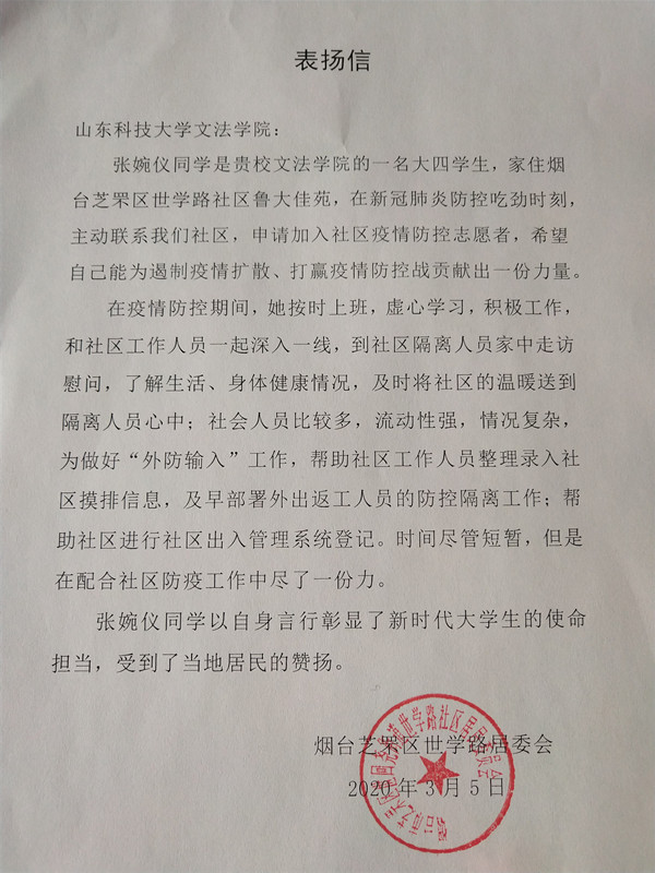 张婉仪是fun88官网体育法学2016级3班员工,家住烟台芝罘区。在新冠肺炎防控的吃紧时刻,她主动联系社区,申请加入当地的疫情防控工作,为遏制疫情扩散、打赢疫情防控攻坚战贡献自己的力量。