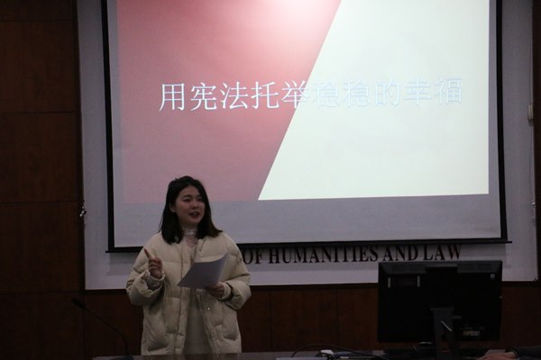 活动伊始,通过播放国家宪法日宣传片,让大家切实感受了宪法与每个人息息相关。杨一欣通过具体事例向大家阐释了为何宪法能托举稳稳的幸福。活动过程中,同学们共同学习了宪法日设立的原因及意义、宪法规定公民的基本权利和义务、十九届四中全会的13个方面的“显著优势”及13个“坚持和完善”。在全体学员宣誓中,此次活动落下帷幕。