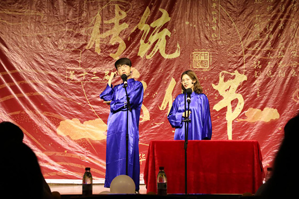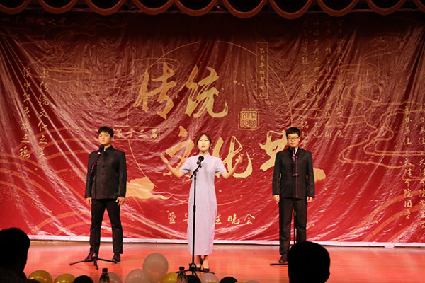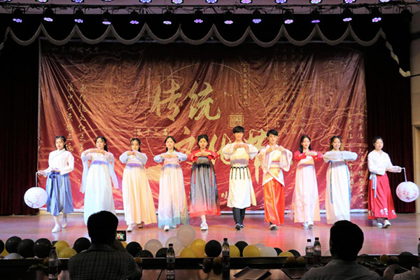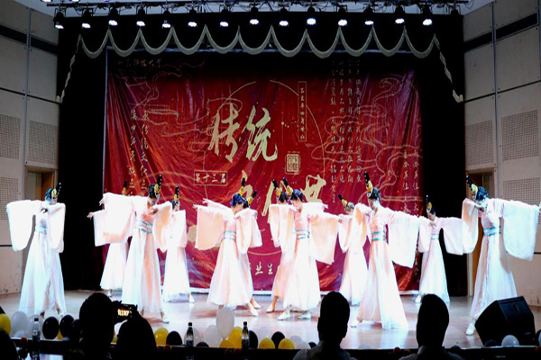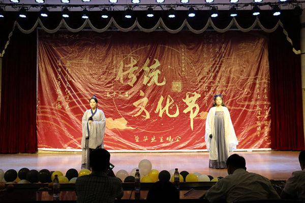 晚会传统韵味浓厚,现场座无虚席,传统艺术表演形式相声、民族器乐演奏、古典舞、歌曲等轮番上演。一首共青团团歌拉开了晚会的序幕,乐器演奏《四季折之羽》宛转悠扬,古典韵味十足;歌曲《刀剑如梦》豪情万丈,一股江湖豪气扑面而来;舞蹈《秦淮五艳》、《清平调》以优美的舞姿描摹出一幅幅绝美的画卷,让人仿佛置身仙境;情景剧《和亲》中,蓝齐儿声泪俱下的表演,令现场观众为之动容;诗朗诵《秋瑾》慷慨激昂,以声音之力描摹现场情景,重现了秋瑾慷慨就义的雄壮画面;相声《上下五千年》幽默风趣,引得现场观众笑声不断;《歌唱祖国》高亢嘹亮,彰显着文法青年人的爱国情怀。晚会节目精彩纷呈、高潮迭起,充分展现了中华民族博大精深,源远流长的文化,台下的观众深深陶醉于本场传统文化演出中。晚会中间还穿插游戏“正话反说”游戏,观众踊跃参与,台上台下积极互动,现场气氛轻松愉悦。