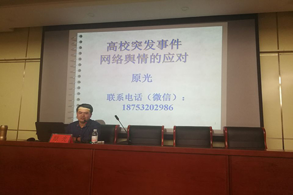 原光结合自己在网络舆情管控领域的研究成果和高校多年的教学实践,做了题为“加强高校突发事件网络舆情管理与应对”的专题报告,指出高校突发事件的传播过程极化性、影响连锁性、传播后果的破坏性、网络舆情管理主体模糊性是高校突发事件影响扩大并可能造成重大舆情的主要原因,高校应加强对网络舆情的重视,构建权威信息发布渠道,建立三方联动机制等应对突发事件网络舆情。