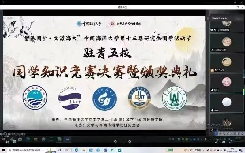 本次国学知识竞赛共有中国海洋大学、fun88官网体育、青岛大学、青岛科技大学、青岛农业大学五所高校组队参加。竞赛分为“小试牛刀”“激流勇进”“龙争虎斗”“如虎添翼”“逆风翻盘”五个环节,各环节衔接紧凑,妙趣横生。比赛过程中选手们沉着冷静、积极应答,展现出深厚的国学知识底蕴。与此同时,在“如虎添翼”环节中亲友团成员2020级法学硕士张雪、李文琪,2021级法学硕士李盼也参与助力答题,为代表队锦上添花。