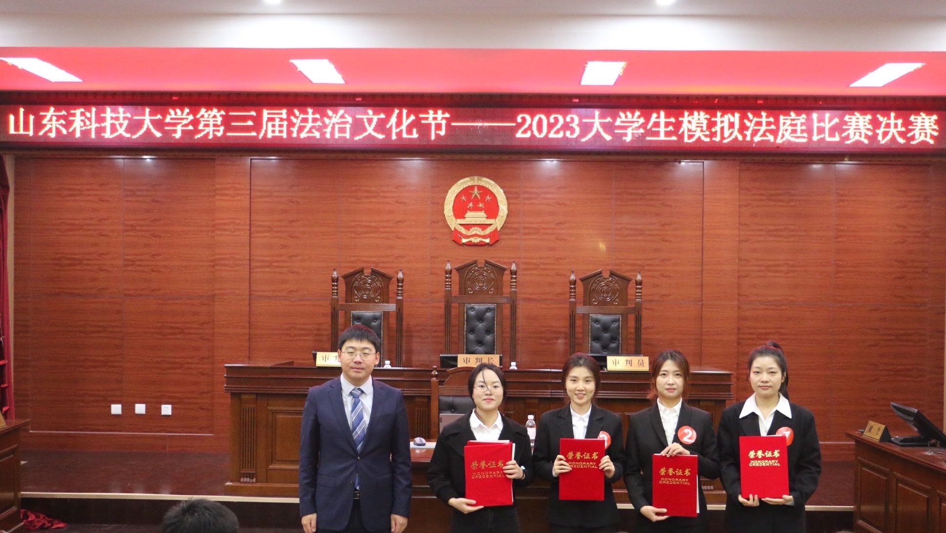 此次模拟法庭决赛合议庭由山东理证律师事务所专职律师宋林浩担任模拟审判长,山东策奕律师事务所主任李光业、上海锦天城(青岛)律师事务所执业律师马春晓担任模拟审判员。决赛评委由山东德衡(西海岸)律师事务所联席合伙人管程程、律师邹文成,山东理证律师事务所专职律师、管委会成员孙小凡,山东诚功(黄岛)律师事务所副主任、刑事部主任于晓波,山东诚功(青岛自贸区)律师事务所副主任、公司部主任韩祎,山东畅策律师事务所主任王玉宝,泰华商恒(青岛)联营律师事务所合伙人张晓倩共7人担任。山东德衡律师事务所权益合伙人王雪妮作为嘉宾出席此次活动。