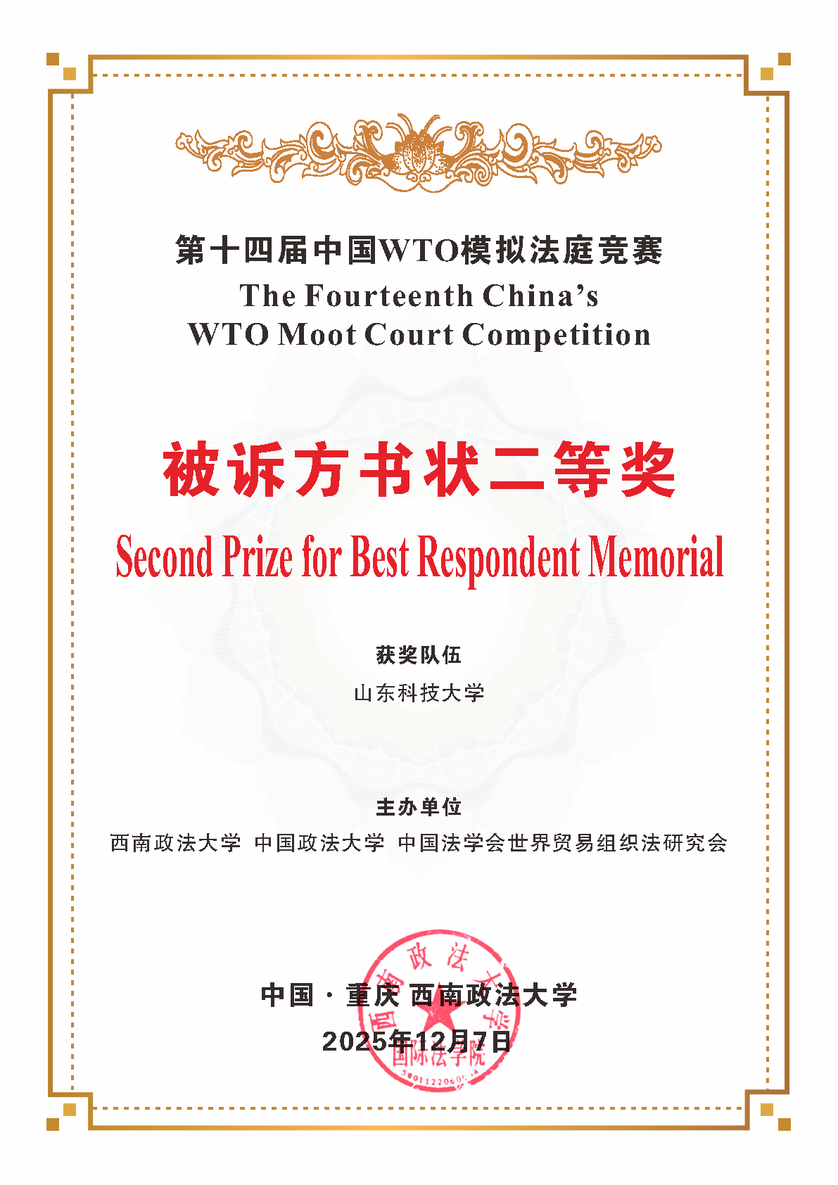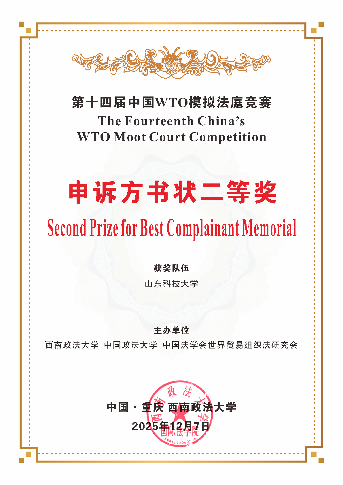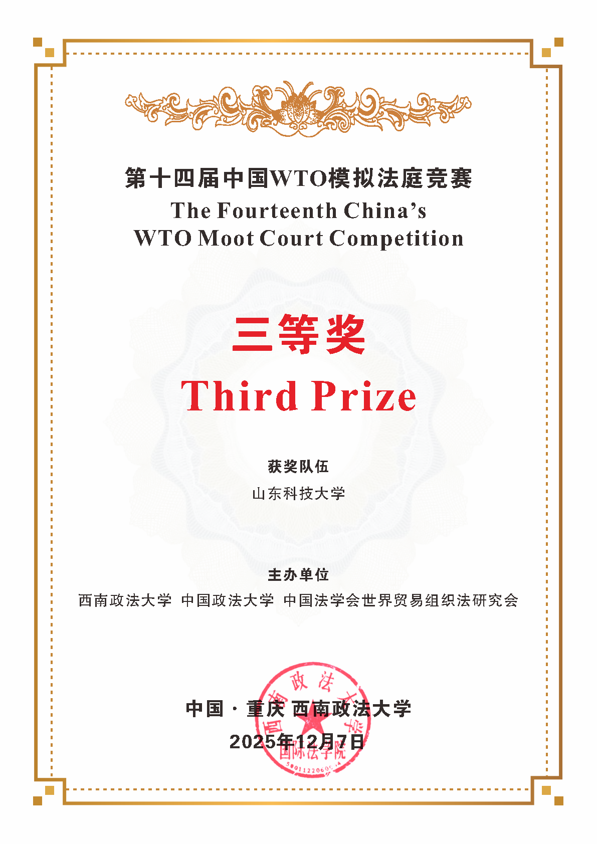 12月7日,第十四届中国WTO模拟法庭竞赛决赛在西南政法大学圆满落幕。经过多轮激烈角逐,文法学院代表队凭借扎实的专业素养和出色的赛场表现,最终荣获全国三等奖,同时获得被申诉方书状二等奖、申诉方书状二等奖的优异成绩,实现了公司在该项赛事上的“开门红”。
