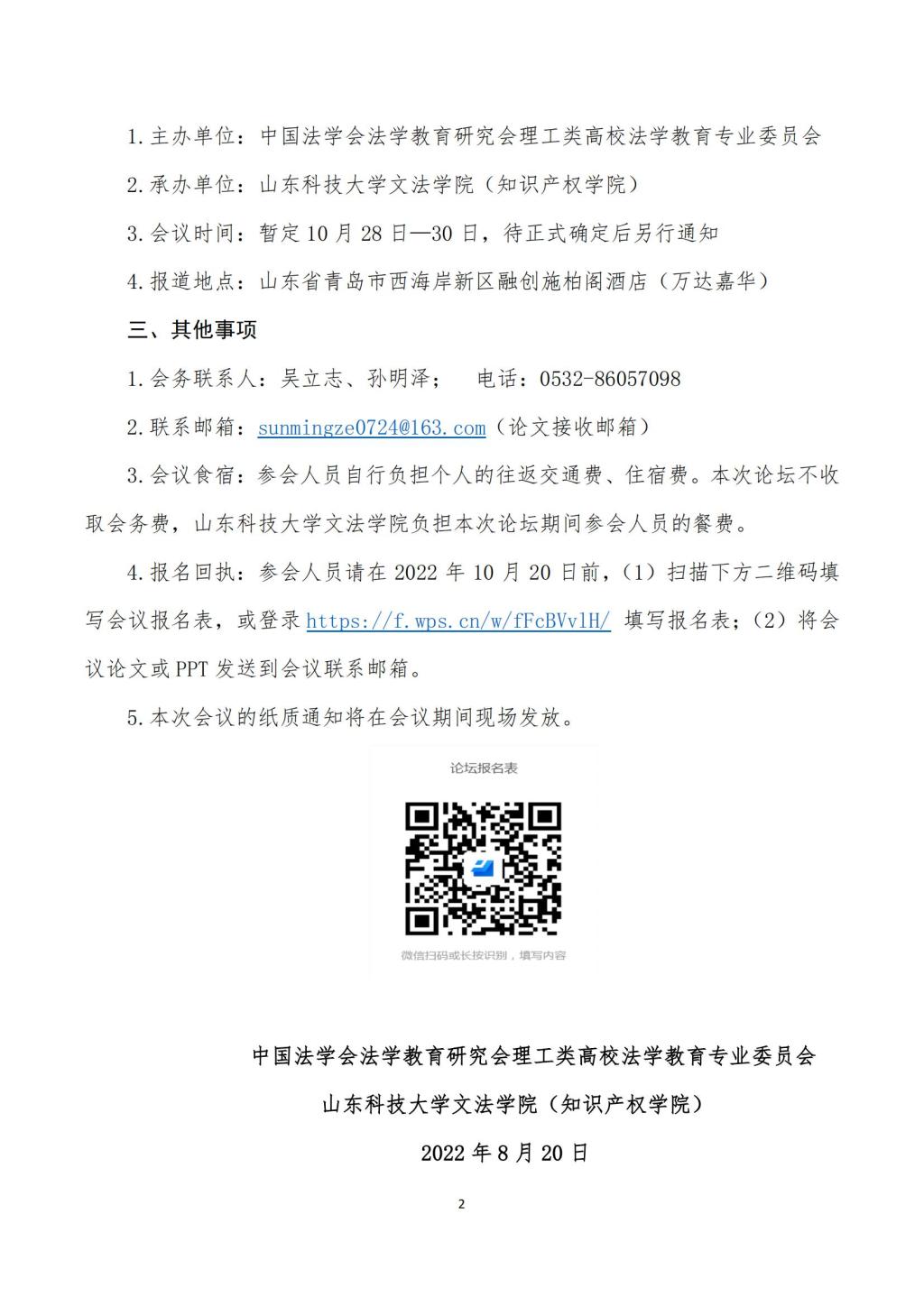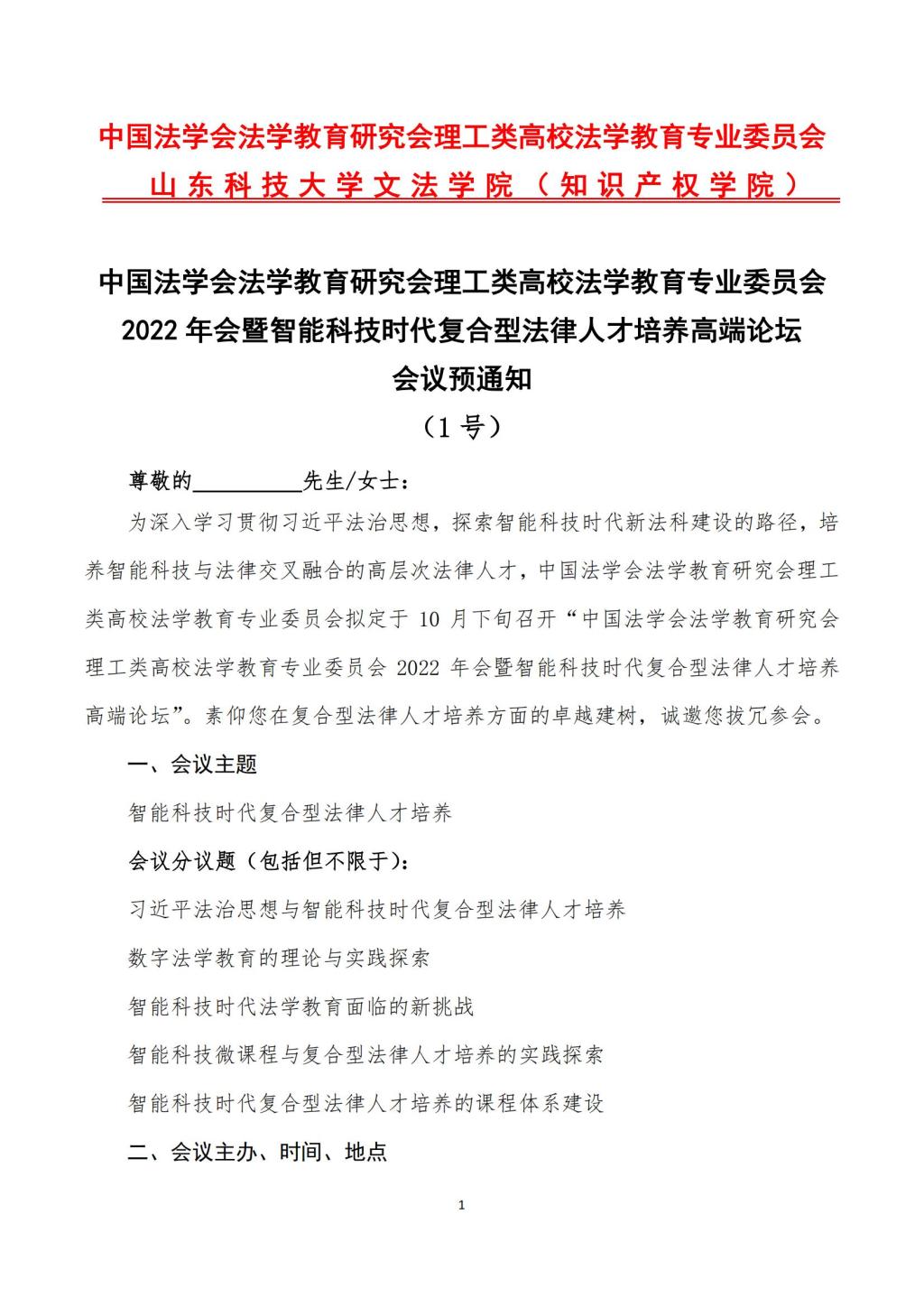 中国法学会法学教育研究会理工类高校法学教育专业委员会2022 年会暨智能科技时代复合型法律人才培养高端论坛会议预通知 (1号)