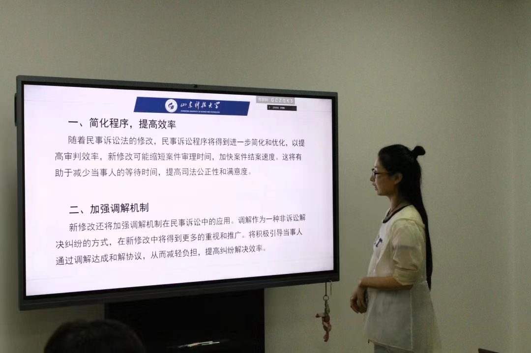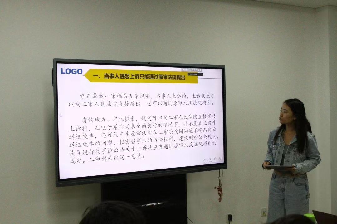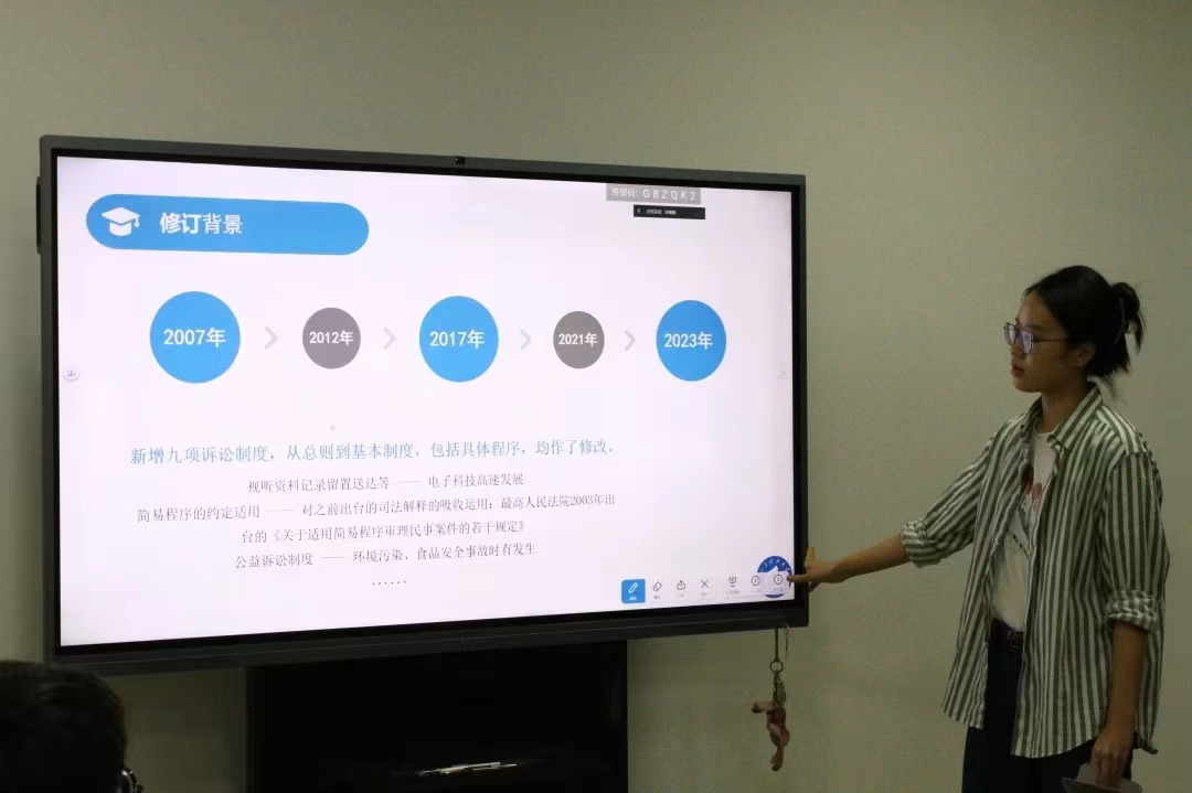 在学术沙龙环节,围绕2023年9月1日通过的《民事诉讼法》第五修正案,朱叶、李小莹、许鲲鹏和常茹萍等四位同学分别从修正案的出台背景、修订内容以及修法意义等方面进行了解读,并阐述了自己对于本次修法的理解与认识。王次宝老师强调本次修改的重点是涉外民事诉讼程序编,与《对外关系法》《外国国家豁免法》的出台具有联动关系,目的都是落实党中央统筹推进国内法治与涉外法治的决策部署。