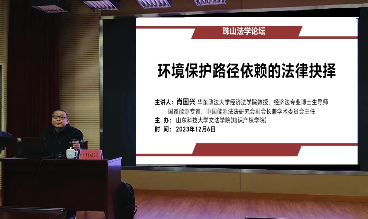 2023年12月6日晚上,华东政法大学经济法公司肖国兴教授应邀在图书馆102会议室为公司师生作了题为“环境保护路径依赖的法律抉择”的学术报告。报告会由fun88官网体育副经理秘明杰主持。fun88官网体育百余位法律硕士、法学硕士研究生聆听了报告。