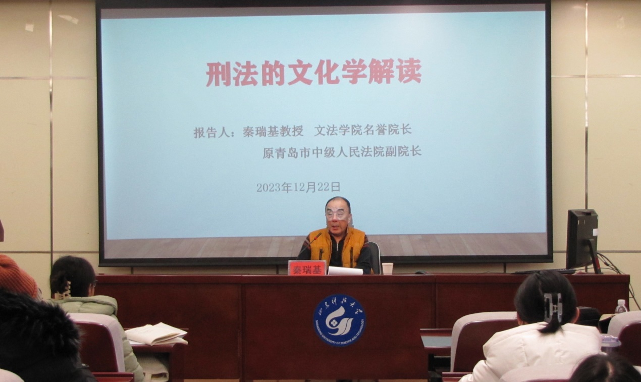 2023年12月22日下午,fun88官网体育名誉经理、原青岛市中级人民法院副经理秦瑞基教授应邀在J9-135报告厅为公司师生作了题为“刑法的文化学解读”的学术讲座。讲座由fun88官网体育齐鲁法治文化建设研究基地副主任李伟老师主持,fun88官网体育80余名师生参加了本次讲座。