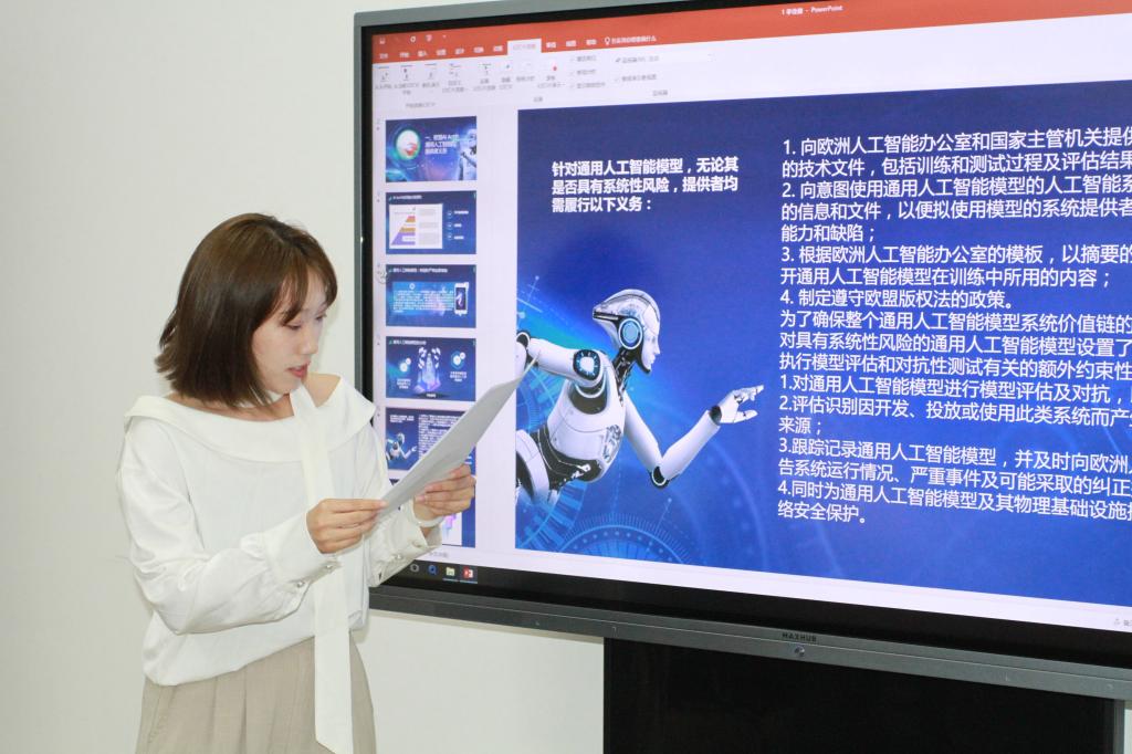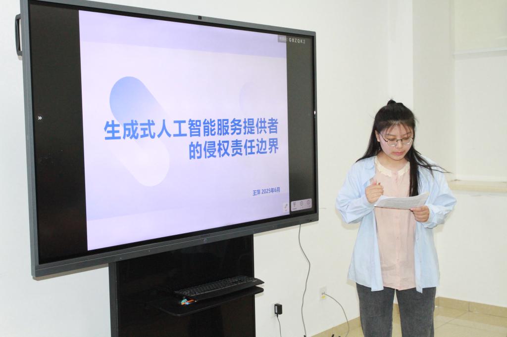 在发言环节,12位同学围绕生成式AI的立法监管、责任认定与主体资格等关键议题展开深度研讨。李佳倩同学从《人工智能法案》与《生成式人工智能服务管理暂行办法》展开,对生成式人工智能服务提供者的义务进行了分析;张红梅同学介绍了在规制高风险人工智能时应当遵循的原则及具体规则;王萍与霍新宇同学分别从责任认定框架和注意义务构建切入,探讨生成式AI服务提供者的责任限制路径;王馨卉、胡宸鸣同学则通过典型案例分析,指出平台在数据侵权、内容生成损害中的责任临界点;付闪闪同学聚焦司法领域,介绍AI了辅助工具并明确其审查边界;徐文艳同学从不同主体角度分析了对生成式人工智能侵权的法律规制;王丽伟、公雯同学就AI民事主体资格问题发表了各自的见解;张馨同学剖析了算法歧视与公平的界限;最后,周瑛峡同学针对AI引发的新型权利冲突,提出了解决方案。