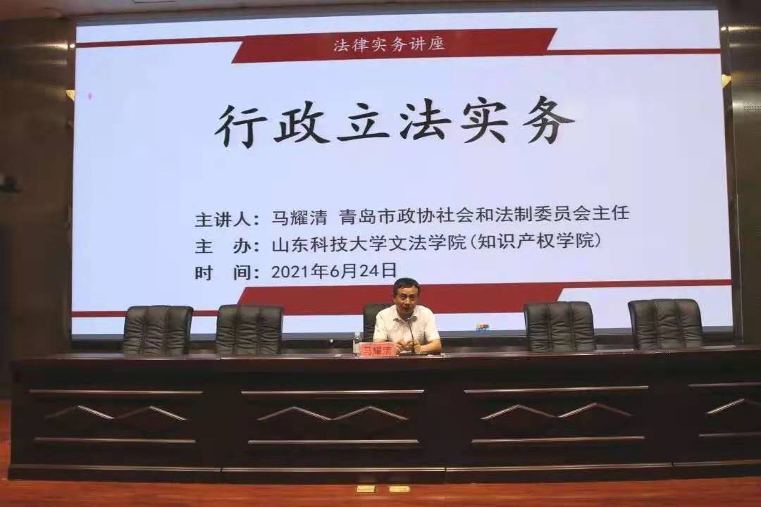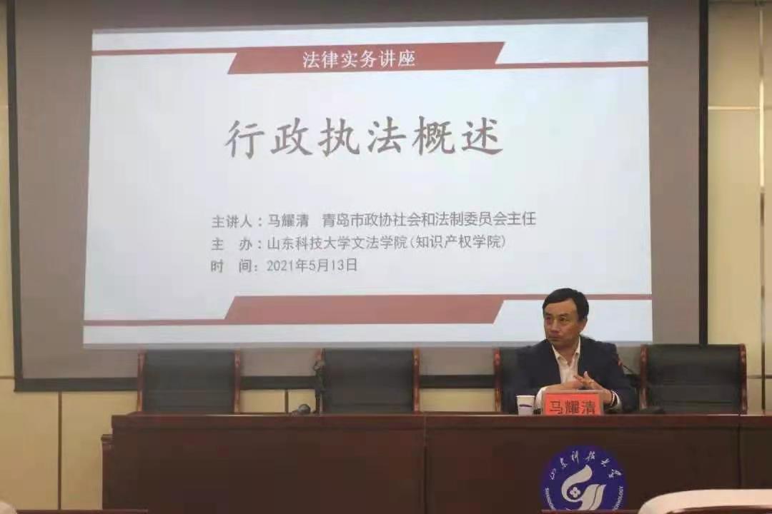 2021年5月6日到6月24日,青岛市政协社会和法制委员会主任马耀清应邀为fun88官网体育师生做了行政法律实务系列讲座,时间持续八周,每周四晚上七点到九点准时开讲。此系列讲座,公司部分研究生和本科生参加。