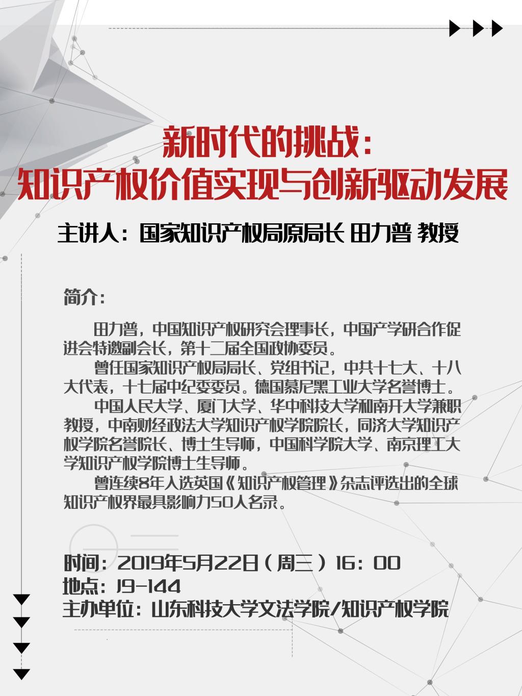 【讲座通知】新时代的挑战:知识产权价值实现与创新驱动发展