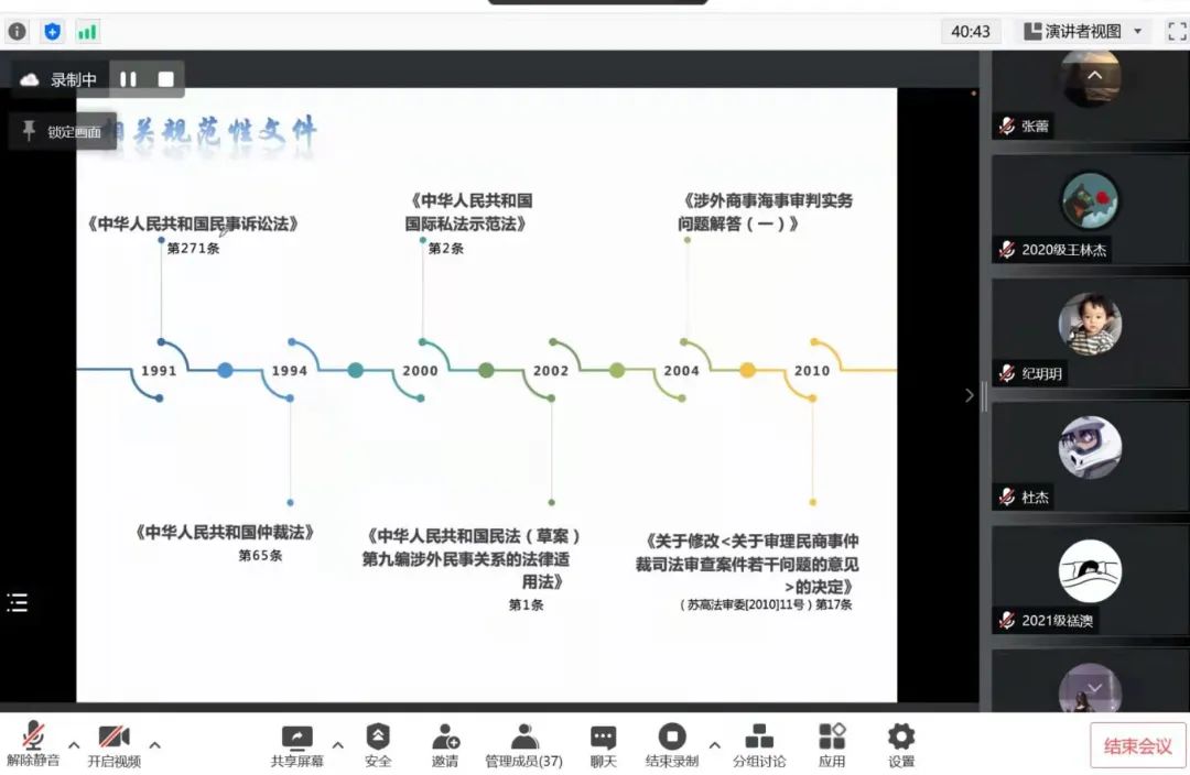 2022年4月13日晚,fun88官网体育国际法研究所在线上成功举办了主题为“一带一路”倡议下的境外仲裁机构协议效力的学术沙龙。本次沙龙特邀华东政法大学副教授李晓郛主讲,国际法研究所孙法柏、韩天竹、单娟、牛哲莉、张蕾等五位老师出席,研究生共33人参加本次沙龙活动,师生共同围绕境外仲裁机构协议效力展开讨论。