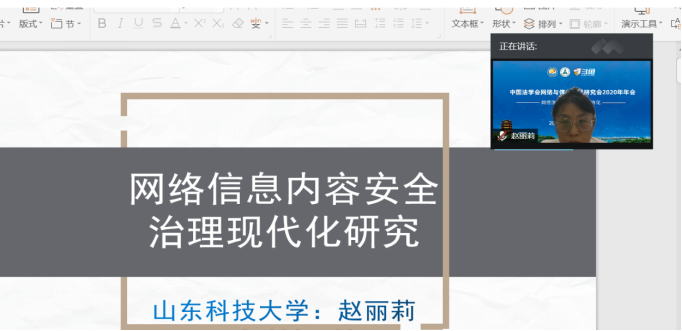 赵丽莉教授2020年9月26日下午受邀在第二分论坛进行了线上主题发言,发言题目为“网络信息内容安全治理的现代化研究”。该分论坛聚焦“网络与信息法学学术体系、学科体系、话语体系”。来自浙江大学、西南政法大学、北京邮电大学、华中科技大学、南开大学、北京航空航天大学、中国政法大学、对外经济贸易大学、华东政法大学、中国人民大学学者共同参与研讨。