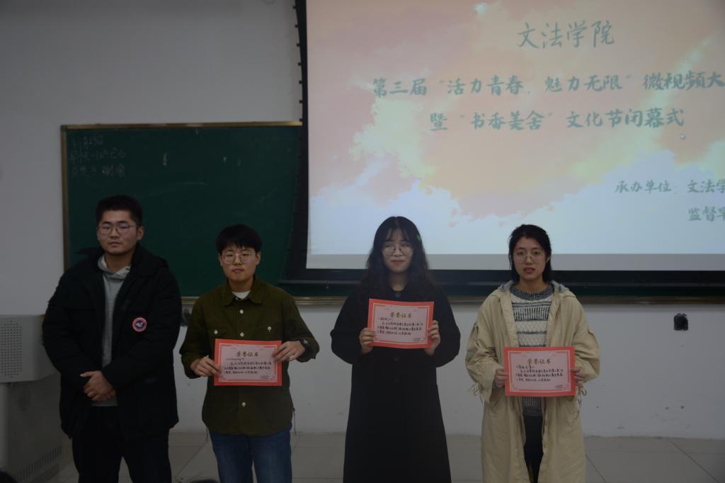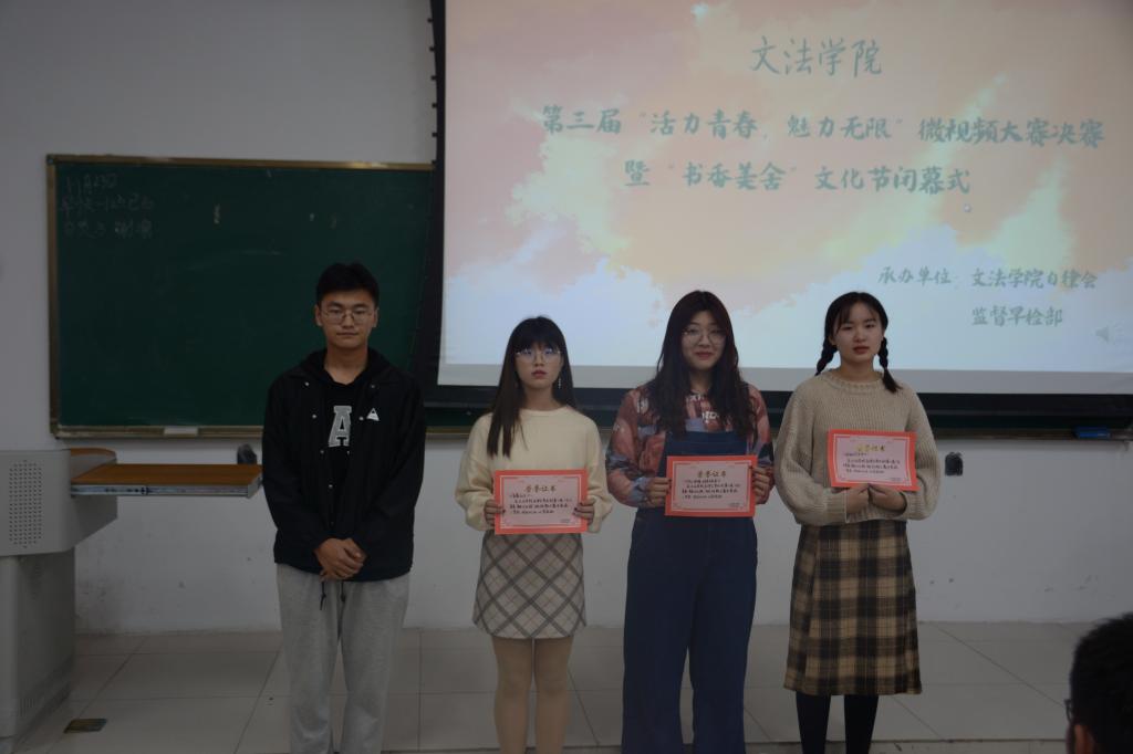比赛开始后,各组选手对其作品进行讲解,评委根据各组的视频内容以及现场讲解进行打分,决出名次。为了让大家更好的回顾和品位每位选手的作品,公司还安排了同学分别在各组作品展示完成后进行歌唱表演。在本次决赛中,每位选手的讲解和作品内容都非常精彩,不时引起在场评委和观众的赞美和掌声。最后,校自律会主任芦胜为一二等奖获得者颁奖,员工公寓楼管会主任刘岩为三等奖获得者颁奖。