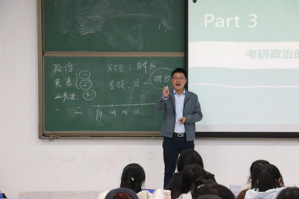 李老师讲解风趣生动,全场气氛热烈,一定程度上解决了同学们关于复习、择校等方面的困惑,帮助构建正确的复习策略,找到契合自身的学习方法,也使得同学们对考研形势有了更加全面的认识,同学们都纷纷表示受益匪浅,收获颇多。(通讯员:王晓迪、李佳昕、南少倩;摄影:贾志悦、郝文静)