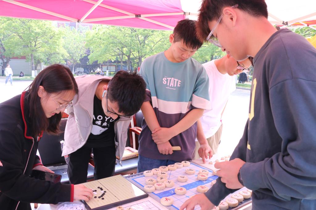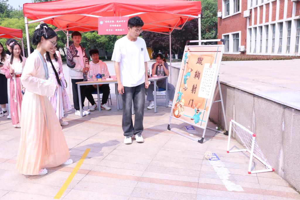 每个活动展位均融入相应的诗词元素,每一次挑战都极富文化韵味,参与者无论是有备而来,亦或是无意路经,面对丰富多彩的活动项目都难免流连驻足。参与者或单枪匹马一人奋战,或几人同行并肩作战,现场每个展位前都热闹非凡。“希圣如有立,绝笔于获麟”“忍把浮名轻换了,浅斟低唱风光好”……优美而有韵律的诗词一句接一句,不容停缓。“投壶”活动难度系数之高,令众多同学跃跃欲试。“象棋博弈”大家集思广益,每当有人成功过关,周围便响起庆祝的掌声。同学们在玩游戏的过程中传承诗歌文化、品味文化经典,在收获欢乐与奖品的同时也感受到中华传统文化的魅力。