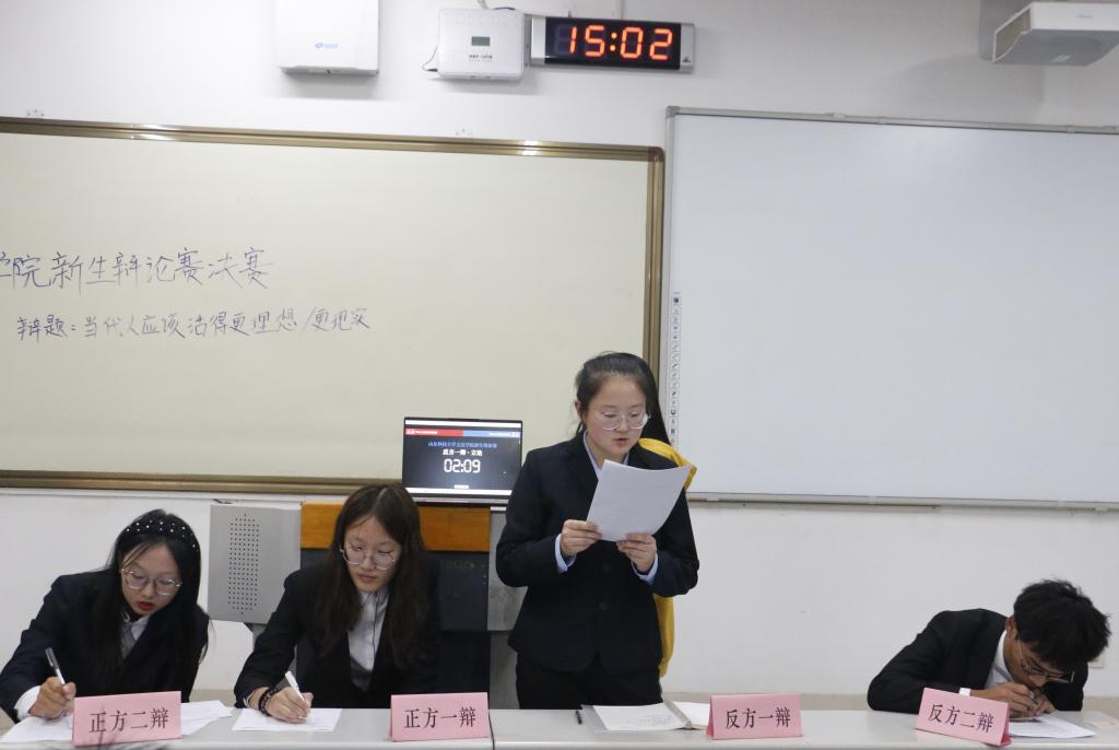 决赛中,正反双方就“年轻人应该活得更理想还是应该活得更现实”展开激烈辩论。经过简单的自我介绍,比赛正式开始。正方一辩以“年轻人应该活得更理想”慷慨陈词,简洁凝练又不乏深刻全面,反方则认为“年轻人应该活得更现实”,陈词更是字字珠玑,掷地有声。在攻辩环节,双方二、三辩妙语连珠,据理力争。自由辩论环节,辩手们反应机敏,你来我往,互不相让,将比赛氛围推向高潮。正反方四辩总结陈词,强调各自所持观点,语言犀利,条理清晰,台下同学凝神聆听,掌声不断。赛后,评委对辩手们的表现进行了点评,对各位辩手的表现表示肯定并提出合理建议。