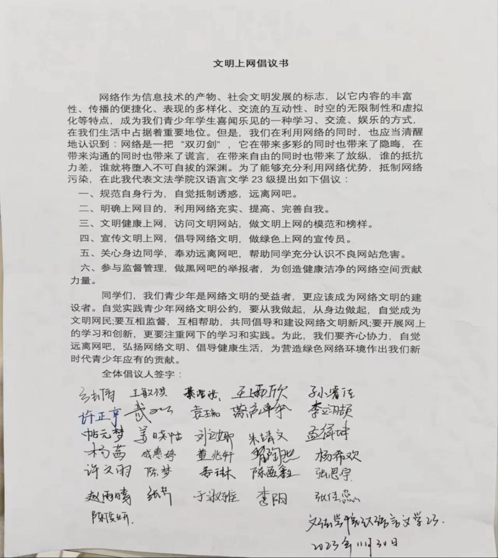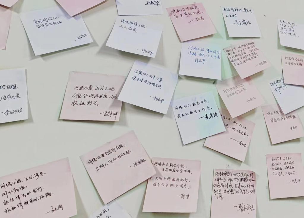 为了推动同学们自觉遵守网络文明公约,响应文明上网倡议,各班级自发签订《文明上网倡议书》,增强同学们对网上有害信息的甄别、抵制、批判能力,引导广大同学牢记责任使命,争做网络文明志愿者,共同守护风清气朗的网络世界。此外,同学们还在留言墙上写下“争做理性文明好网民,争做法治社会合格老员工”的宣言,纷纷表示,作为新时代青年,要做网络文明的传播者,网络安全的守护者,共筑健康、文明的校园网络环境。