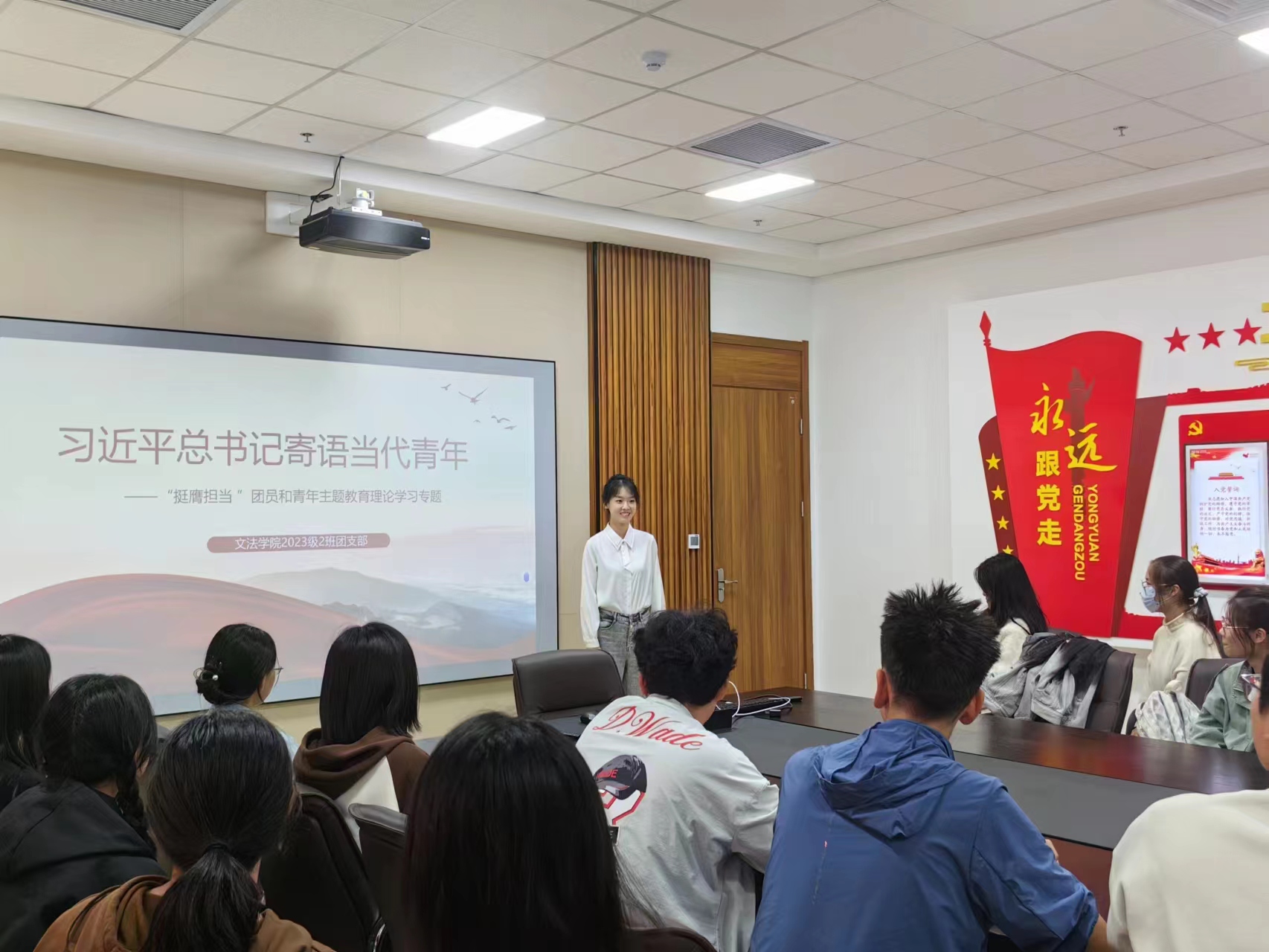 团支部书记上官佳诺向团员们深刻阐释了什么是“挺膺担当”,如何“挺膺担当”,并重温了习近平总书记对青年的寄语:“立足新时代新征程,中国青年的奋斗目标和前行方向归结到一点,就是坚定不移听党话、跟党走,努力成长为堪当民族复兴重任的时代新人。”她强调,同学们要牢记总书记谆谆嘱托和殷切期望,要在强国建设的伟业中挺膺担当,要在民族复兴的道路上勇当先锋队,才能不负时代、不负华年,才能让青春绽放绚丽之花。