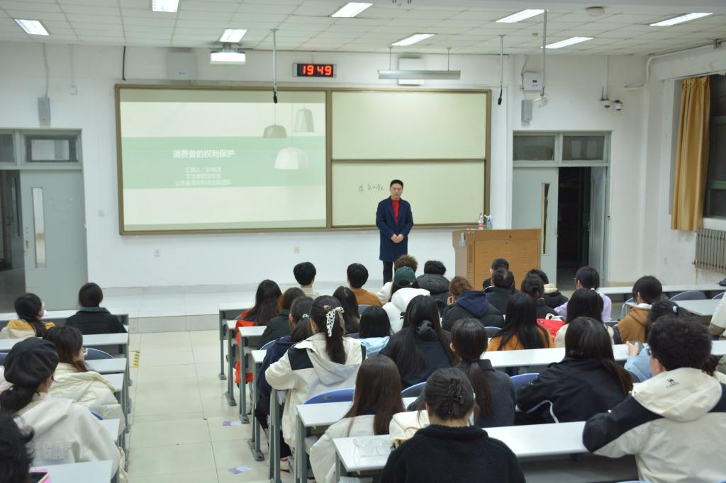 本次讲座由法学系老师孙明泽担任主讲。孙老师以近年来消费者权益保护领域的典型案例为引,详细剖析了消费者在现实生活中可能遇到的权益侵害问题,并结合《中华人民共和国消费者权益保护法》等相关法律法规,对消费者的基本权利、维权途径等方面进行了介绍。讲座过程中,孙老师还特别强调了消费者在维权过程中应注意的事项,他指出,消费者在遇到权益受损时,应保留好相关证据,以便在维权时能够提供有力的证明,通过法律途径维护自己的合法权益,共同推动消费者权益保护工作的深入开展。