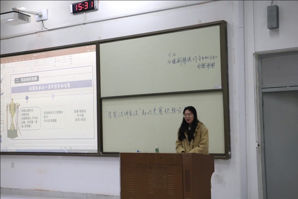会上,法学2022级4班房晓昱分享了参加“学宪法 讲宪法”知识竞赛的心路历程和宝贵经验。她从备赛过程中的细节、比赛中的注意事项,同时结合自身经历总结比赛的经验与技巧,包括宪法知识的系统学习方法,如通过研读专业书籍、分析典型案例来加深对条文的理解;利用多种记忆技巧巧妙掌握繁杂的宪法内容,在讲到竞赛技巧时,强调了时间管理、答题策略以及保持良好心态的重要性。在互动提问环节,现场气氛热烈,同学们踊跃提问,她建议有意向参赛的同学早谋划、早准备、早推动,理论与实操两手抓,争取在以后比赛中取得佳绩。