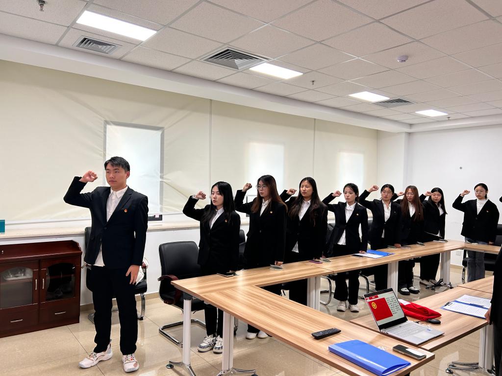 入团仪式在激昂的国歌声中拉开序幕,全体师生庄严肃立,齐唱国歌。会上王晓迪宣读了新团员发展名单,本次共有11名同学经过层层考验与选拔,光荣地加入了中国共产主义青年团。全体辅导员为新团员佩戴团徽并颁发团员证,优选辅导员李达带领全体新发展团员庄严宣誓。