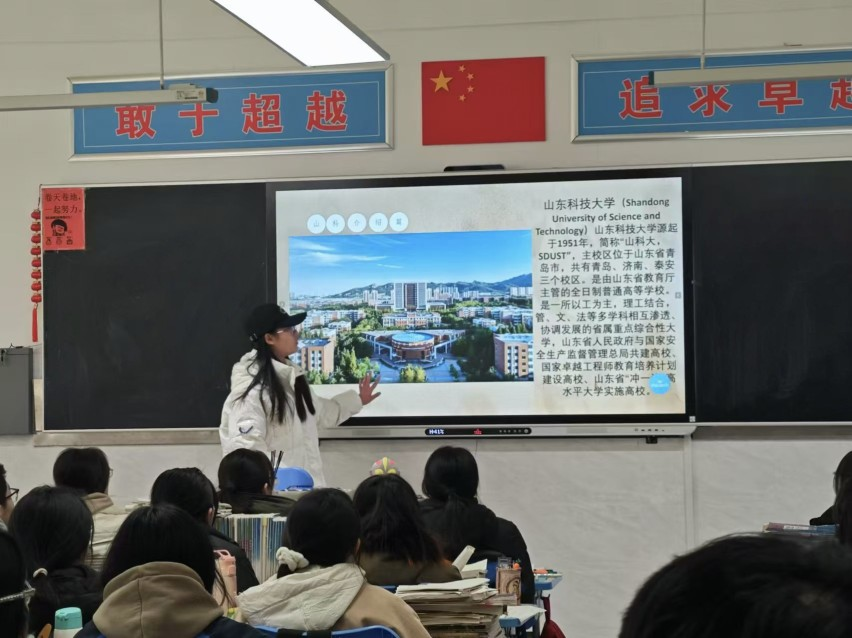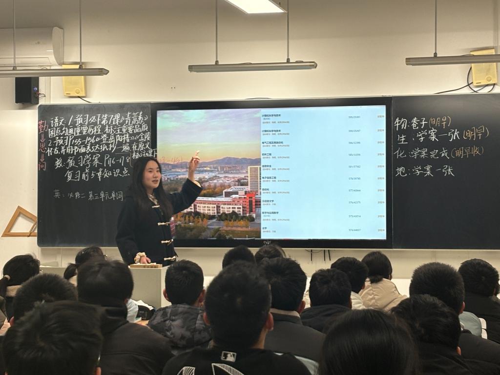 法学24级1班的王璐瑶,踏着新学期的晨曦,走进了山东省邹城市孟子湖中学。在晚自习的静谧时光里,她化身为山科的使者,不仅细数学校的王牌专业与办学特色,让同学们对山科的专业设置有了初步了解,更通过生动的“云游”体验,让高一的学弟学妹们仿佛置身于山科的校园。作为刚经历高考的“过来人”,王璐瑶分享了自己的学习经验和感悟,解答了学弟学妹们的疑问,也满足了他们对老员工活的美好期待。