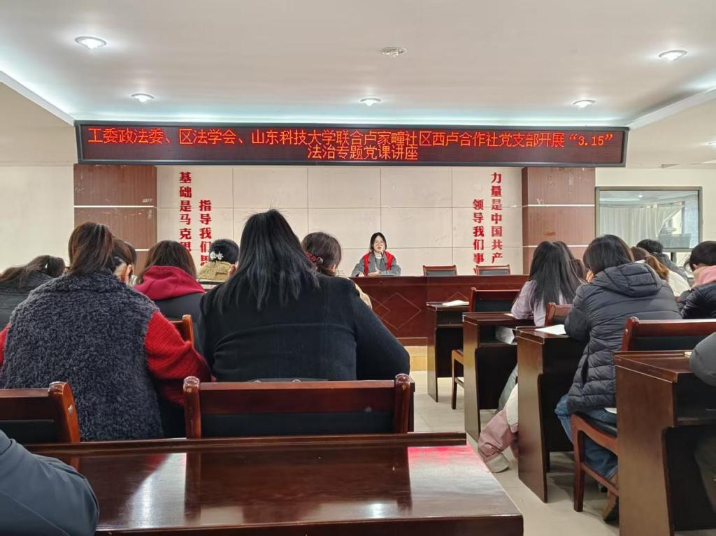 在第43个“3.15国际消费者权益日”到来之际,为进一步弘扬法治精神,夯实法治保障,增强社区居民法治意识,切实维护消费者合法权益,3月13日,西海岸新区工委政法委、区法学会联合fun88官网体育法治教育党支部走进隐珠街道卢家疃社区,为政法干警、社区党员干部和群众开展了一场主题为“维护消费者权益,共建和谐消费环境”的“3.15”消费者权益保护法治讲座。