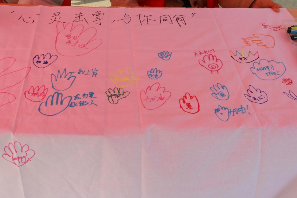 活动当天,志愿者们热情洋溢,积极引导参加活动的同学们拿起画笔,在画布上描绘出彩色手掌图案,并写下对自己或他人的美好祝愿。“祝我天天开心”“学会接纳不完美”等等,一幅幅充满温度的手绘作品汇聚成了一面“心理支持之墙”,传递出了互助共情的正能量,吸引了众多同学驻足观看。参加此次活动的同学们纷纷表示,通过此次活动,能够宣泄烦恼,缓解压力,以更好的状态继续前行。