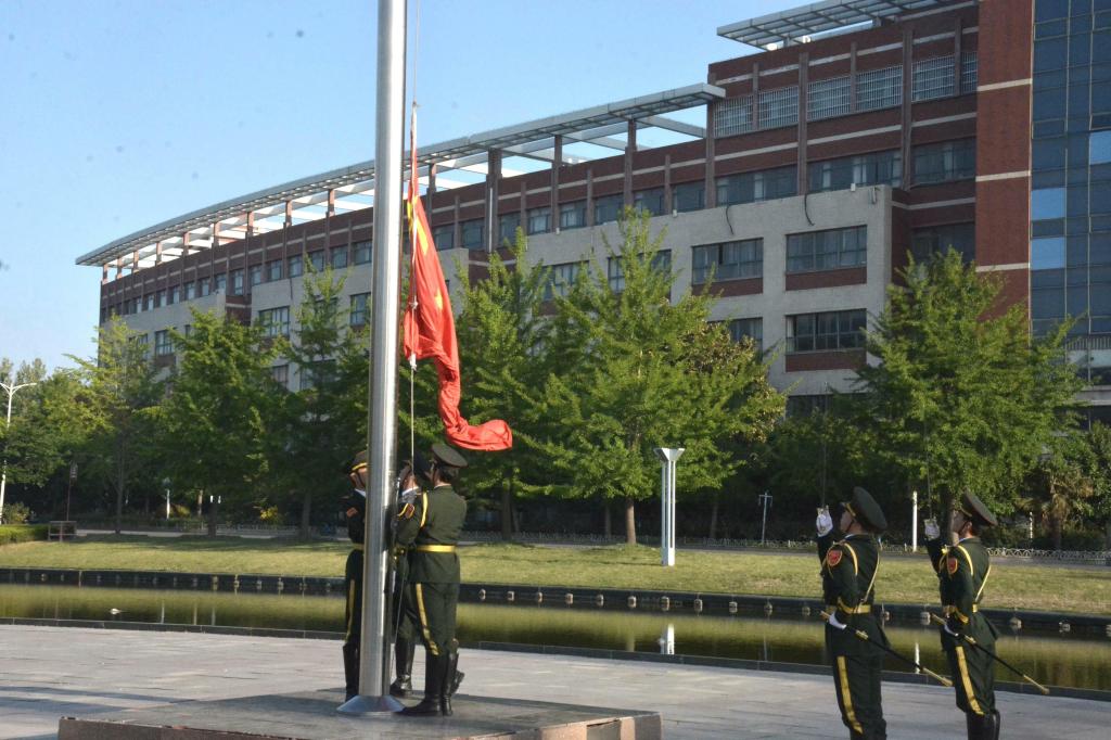 清晨,国旗护卫队迈着铿锵步伐护卫国旗入场。伴随着雄壮的《义勇军进行曲》,五星红旗冉冉升起,全体师生肃立行注目礼。