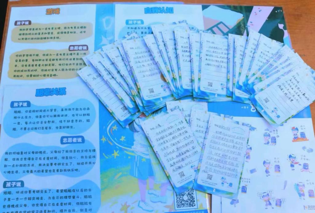 “纸短情长——致陌生的TA暖心赠语”板块分为“校园心灵邮差”和“远方的来信”两部分。员工们为陌生同窗撰写匿名鼓励信件,内容涵盖学业支持、生活感悟等。同时,活动特别设立留守儿童心理服务项目,创新设计了沉浸式互动体验模式,现场招募近200名“蓝信封”通信大使,为留守儿童提供心灵支持。