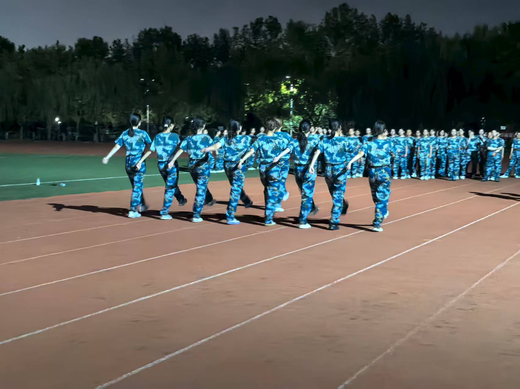 训练场上,灯光照亮整齐的队列,教官以规范动作为示范,围绕齐步走、正步走等基础科目展开强化训练。“手臂再抬高”“步伐再对齐”,教官的指导声清晰有力,新生们认真领会动作要领,反复打磨动作细节,即使额角渗汗也始终保持着挺拔姿态。休息间隙,各连队的拉歌互动点燃训练场氛围。“听吧新征程号角吹响”的歌声响彻夜空,此起彼伏的口号与欢笑驱散了一天训练的疲惫,也让新生们在团队协作中增强了集体凝聚力。