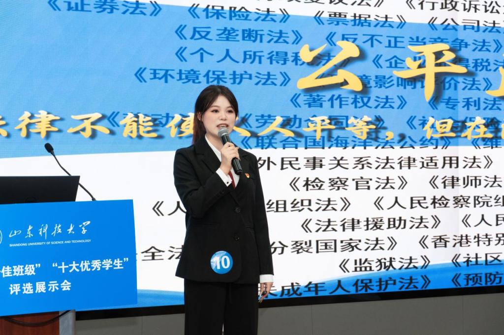评选展示会上,兰煜琦以“星星点灯,与法同行”为题,以“求索、创新、担当、公正”为主线,讲述了自己的拼搏成长之路。她深耕专业、筑牢根基,学习成绩优异,三年课程平均成绩92.1分,连续两年获得国家奖学金。她厚积薄发、勇于突破,主持国家级老员工创新创业训练项目1项,并独立发表论文1篇,以第一负责人身份获得全国高校商业精英挑战赛涉外商事法律服务竞赛一等奖、文旅会展竞赛全国一等奖、品牌策划竞赛全国一等奖等省级以上竞赛奖项12项。她知行合一、服务奉献,作为第一负责人获批国家级社会实践团队2支,获得全国老员工志愿宣讲活动优秀团队、优秀宣讲视频、山东省“三下乡”社会实践优秀员工、优秀团队等校级以上表彰20项。目前,兰煜琦已通过“全国统一法律职业资格考试”并推免至西北政法大学攻读硕士研究生。