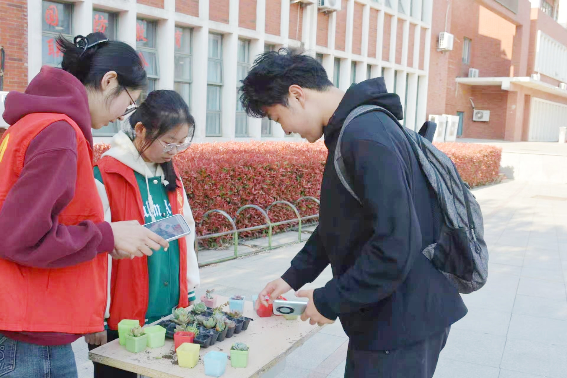 竞答题目设置涵盖了生态文明政策解读、低碳生活实用常识、资源循环利用有效方法等多个领域。为了进一步激发同学们的参与热情,活动特别设置了奖励机制:凡参与竞答的同学均可获赠一盆可爱的多肉植物。在互动环节中,同学们还结合日常生活实际,围绕校园垃圾分类、节水节电、减少一次性用品使用等话题展开交流。